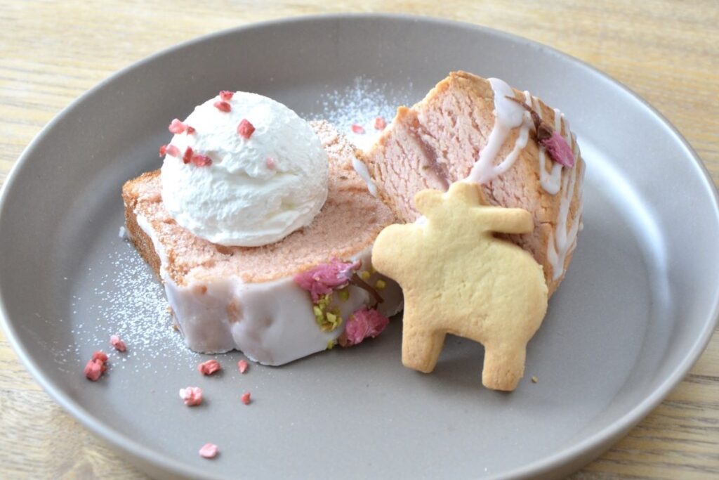 「kojikaブラウニー」(380円)も人気。しっとりとしたブラウニーと、サックリとしたシカのクッキーとの相性が抜群です。4月末までの限定商品「桜サンドスコーン」と「桜パウンドケーキ」(いずれも380円)は、さくらあんを使い、春らしいきれいなピンク色に。カフェでは、お菓子にシカのクッキーやクリームを添え、ドリンクとのセット(1000円から)で提供します。