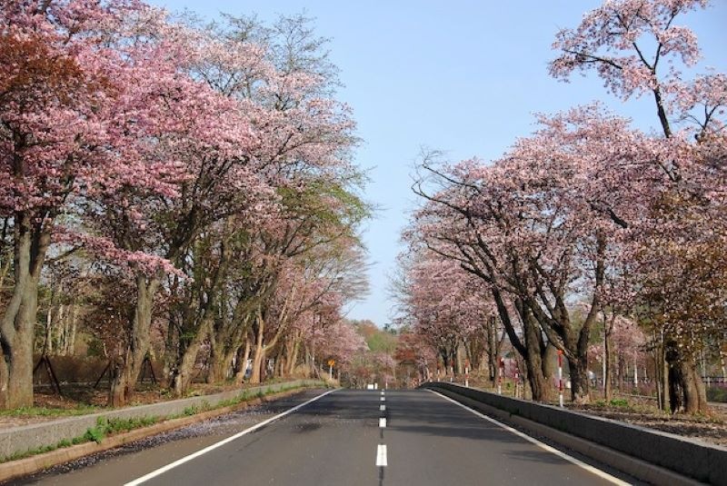 現天皇陛下の生誕をお祝いして、地元の住民がJR登別駅から登別温泉方面へ向かう約8キロの道の両側に植えた約2,000本のエゾヤマザクラが生長。今では登別の桜の名所に。満開時には、桜のトンネルが完成。登別温泉やカルルス温泉に向かう観光客の目を和ませてくれます。