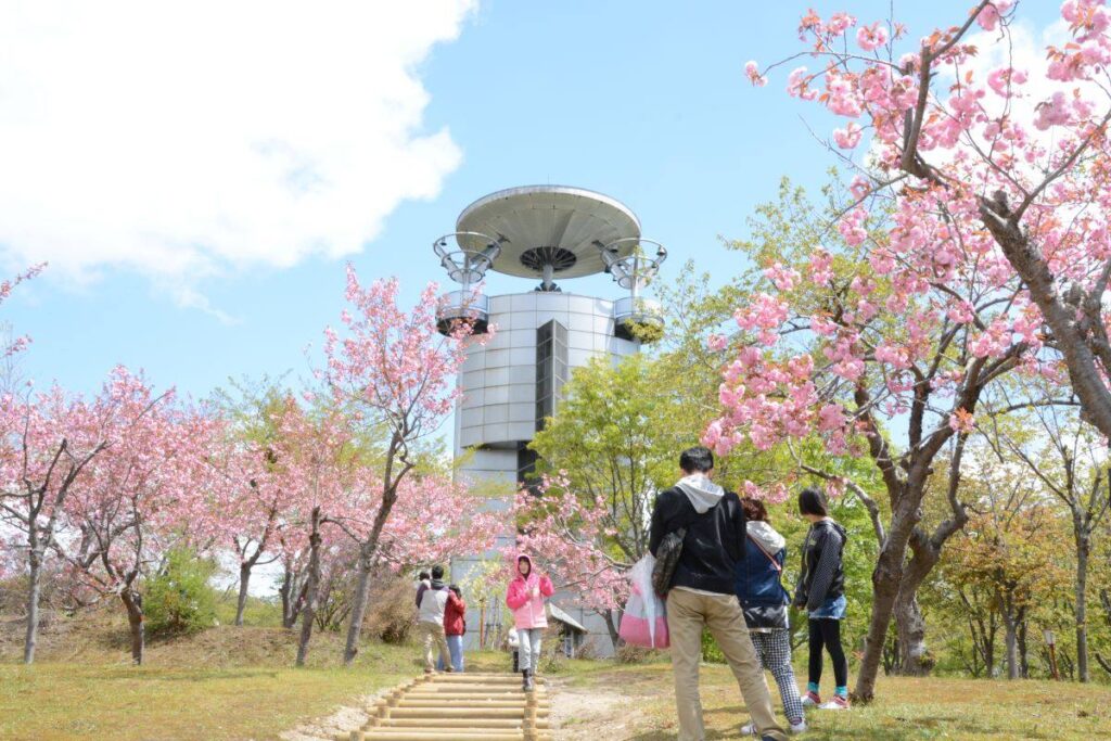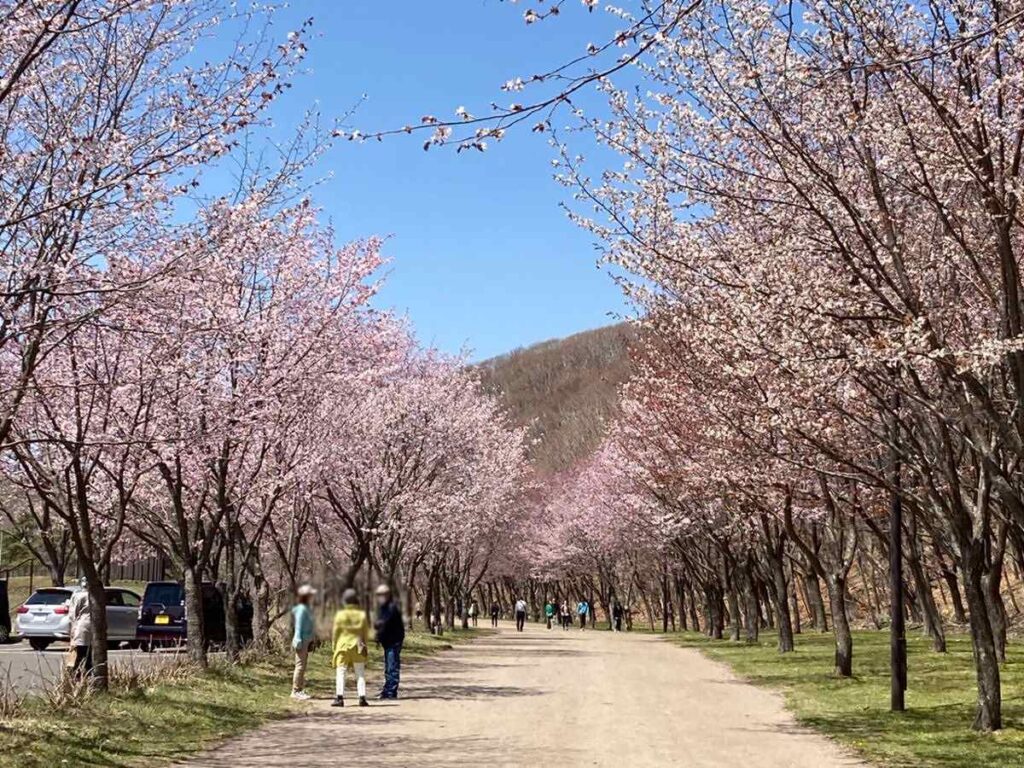 エゾヤマザクラやソメイヨシノなどが約1,800本植えられています。展望台に向かう途中、桜のトンネルを楽しむことができます。