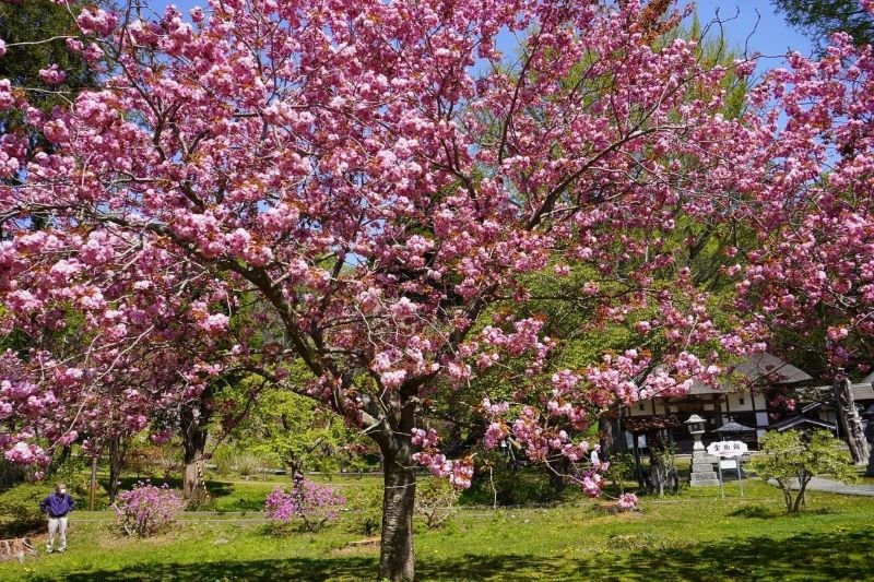 蝦夷三官寺のひとつ、善光寺は、巨大な噴石を割って幹を伸ばす「石割桜」があります。境内と隣接する自然公園にある桜を合わせると約1,000本もの桜がある伊達市の名所。様々な品種の桜が順次咲くことから、ピンクの濃淡が見られ、長期にわたって花見を楽しむことができます。