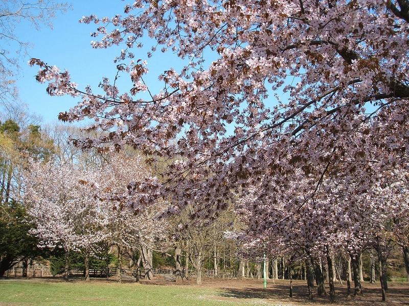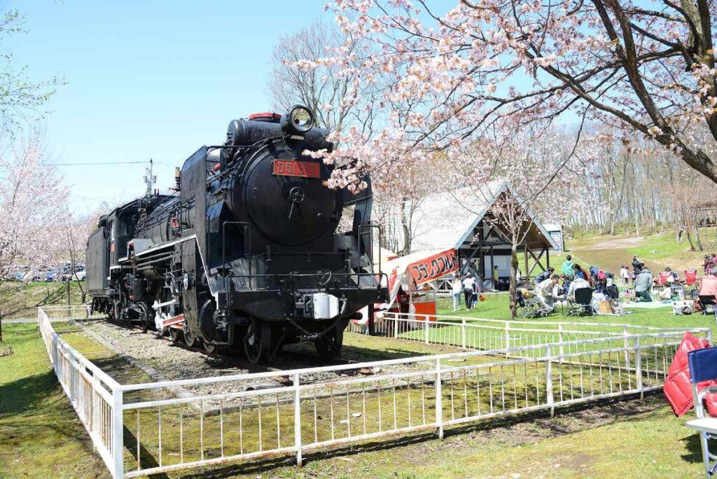 エゾヤマザクラ、チシマザクラなど約 800 本の桜の木があり、深川市内の桜の名所として知られる自然公園です。公園内には SL が展示されており、美しい桜に包まれた SL を見ることができます。今年はさくら祭りの開催がありません。桜の開花状況は深川市HPに掲載されます。
