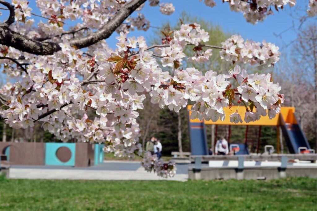 世界的な彫刻家イサム・ノグチの設計による公園内には、約1,600本のサクラが植樹されているサクラの森があります。森には、7つの遊具エリアがあり、設置されている遊具126基すべてがイサム・ノグチのデザイン。大人はサクラを愛で、子供はカラフルな遊具で遊べますので、家族で楽しめる空間になっています。遊具の一部は使用不可となっており、遊具についてはモエレ沼公園HP(https://moerenumapark.jp/pdf/restoration.pdf)を参照してください。