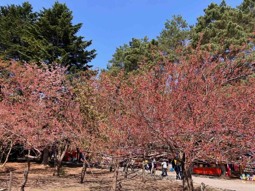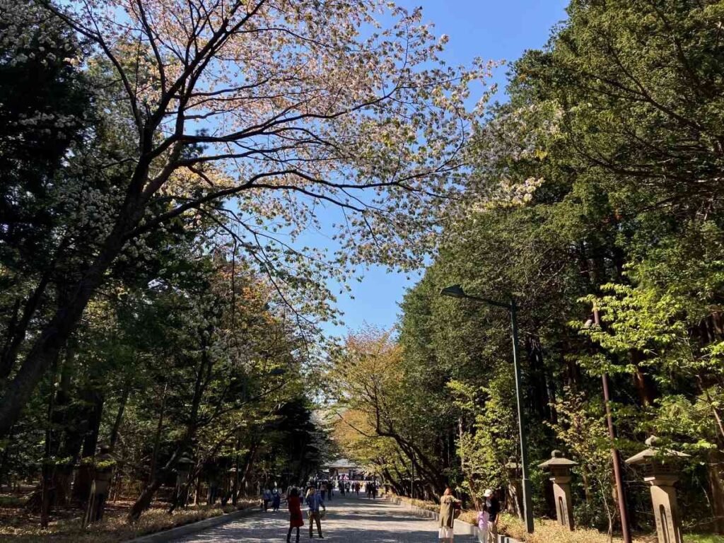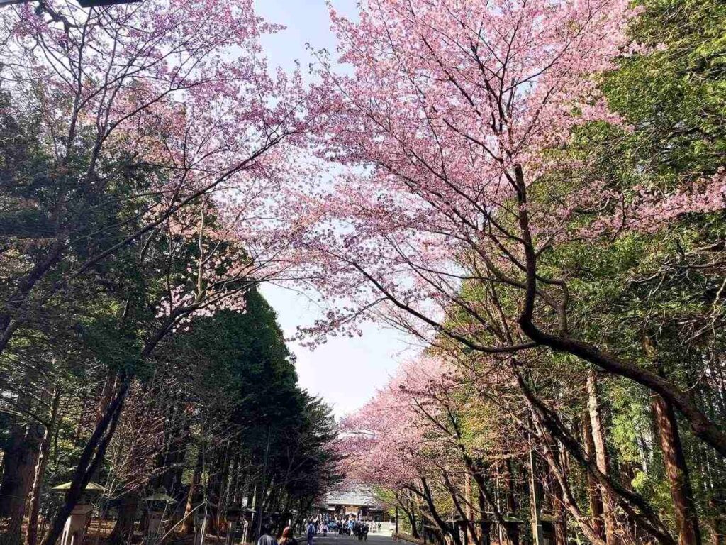 毎年春になると参詣者はこの桜のトンネルをくぐってお参り