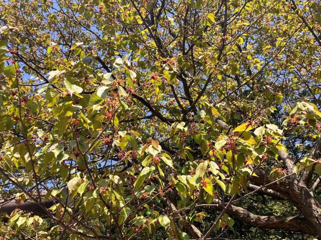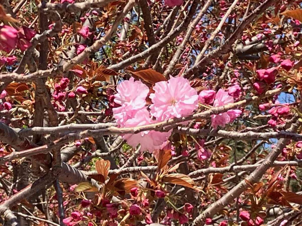 このあたりに多い、最も遅咲きのヤエザクラが咲きはじめており、連休終盤に見ごろとなりそうです。