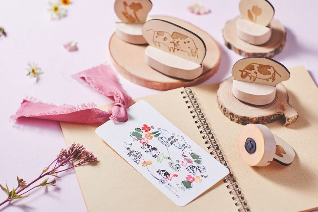 これは、ゲスト⾃ら花を植えて、⽔やりをし、花咲くファームガーデンの装飾をスタッフと⼀緒に創り上げる体験です。⾃分好みの⾊の花を選んでファームエリアを彩ります。また、花を植えるエリアの⼟には、ホテルから出た⽣ごみで作られた堆肥を使⽤。堆肥ができる過程や、ファーム星野の成り⽴ちを知りながら、実際に花植え体験ができます。さらに体験後は、ファームエリアが描かれたしおりに、そこで暮らす⽜や、⾊とりどりの花のスタンプでデコレーションし、思い出を形にして持ち帰ることができます。