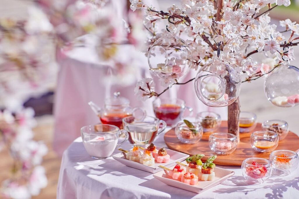 お茶は、定番の紅茶のほかに、ほんのりと⽢い「⽩樺ティー」や桜の⾹りが華やぐ「桜ラテ」など、さまざまな味わいの6種類のお茶を⽤意。お⾷事系のお花⾒団⼦には、紅茶や⽩樺ティーを合わせることでさっぱりした味わいになるのが特徴です。お花⾒酒もお茶も好きなだけ堪能することができるので、さまざまなトッピングのお花⾒団⼦とあわせて楽しめます。