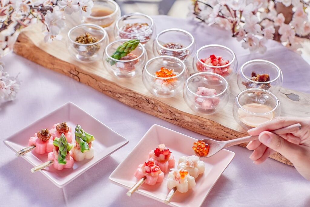 桜型をしたお花⾒団⼦に、みたらしやいちごなど王道のスイーツ系のものから、バター醤油、蟹いくらなどのお⾷事系のものまで合計10種類のトッピングを組み合わせて、さまざまな味を楽しめます。トッピングには、他にもトマム⽜乳(リゾート内で飼育している⽜から絞った⽜乳)を使⽤したミルクジャムや、北海道のお花⾒の定番であるジンギスカンを⽤意。北海道ならではのものから春の味覚のものまで、⾃分好みの組み合わせを⾒つけて、お花⾒団⼦を楽しめます。
