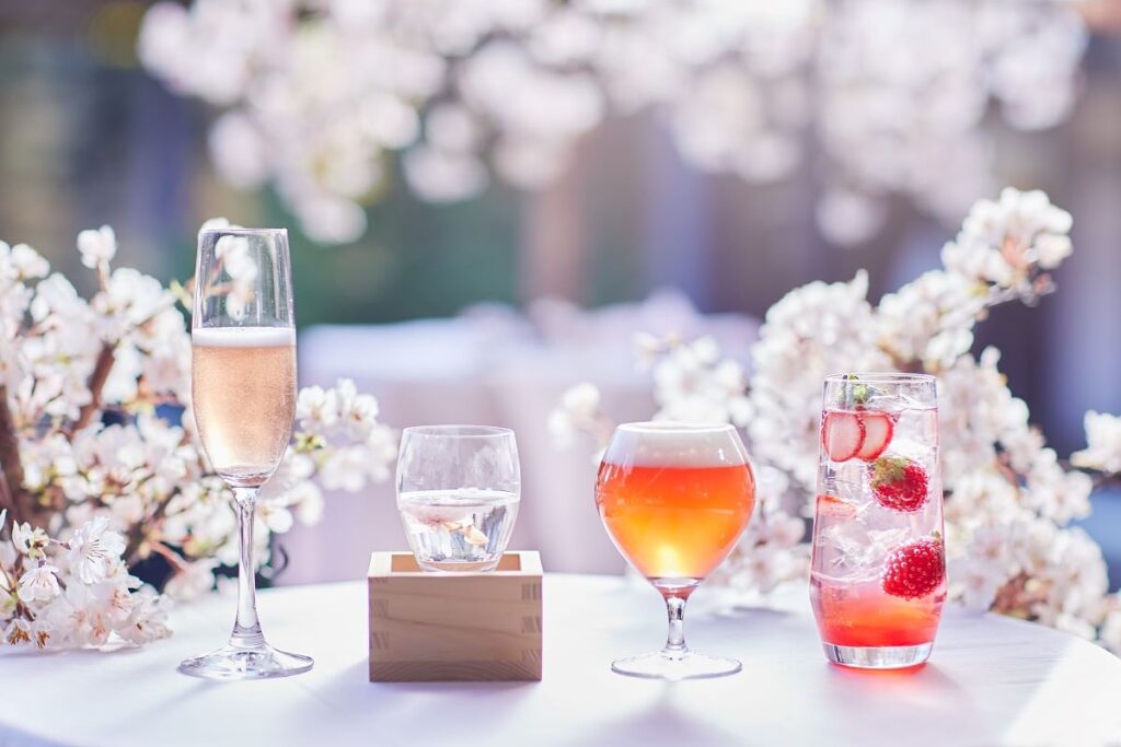 今年はお花⾒団⼦の味を引き⽴てるお茶のほかに、お花⾒酒も提供します。お花⾒酒はロゼスパークリングワイン、⽇本酒、桜のビール、苺とホエーのカクテルの4種類を⽤意。⾒た⽬も春らしいお花⾒酒が、お花⾒気分を盛り上げます。