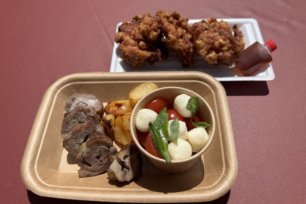 フードはそれぞれが気になったものを調達してきました。ザンギで有名な「布袋」は初出店。イベント限定の「布袋式ザンギ」(800円)は北海道産ゆめぴりかの米粉を使った10センチほどの大きなザンギがごろんと3個。米粉のおかげか、表面はパリパリ、中はしっとりジューシーです。