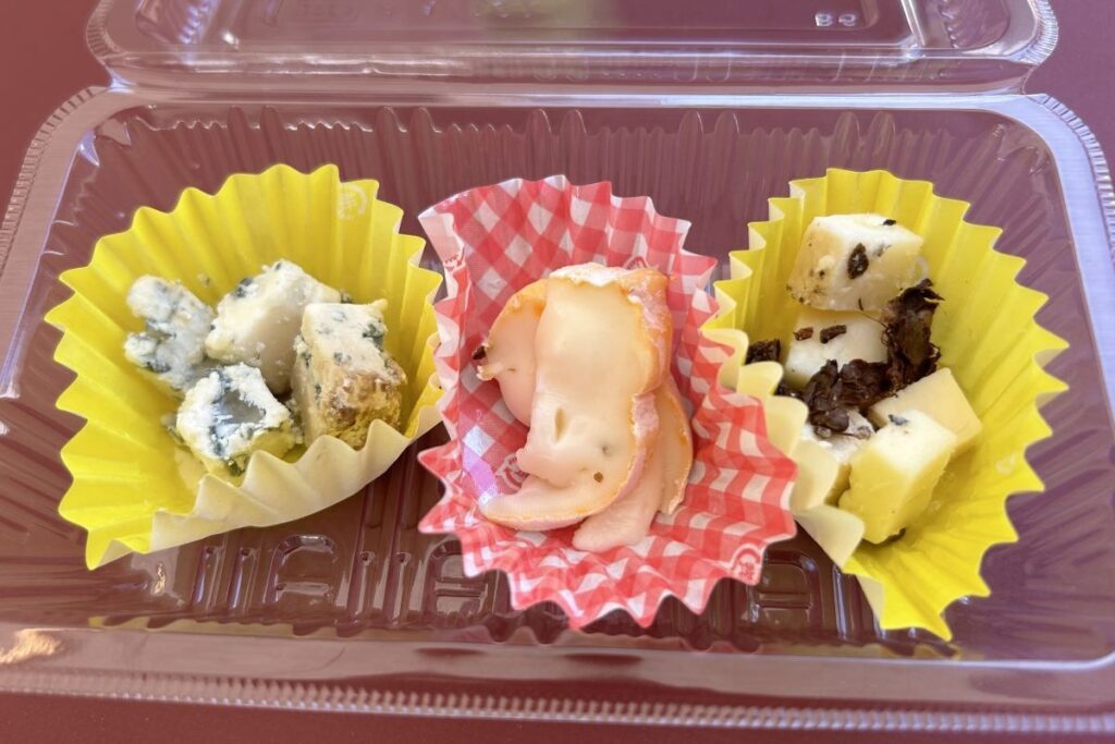 せっかくワインがあるので、北海道産チーズコーナーでチーズを入手しました。カットしたチーズを入れた小さなカップがあり、3種類で800円。20数種類の北海道産チーズの中から、日替わりで7~8種類が並びます。旭川市「伊勢ファーム」の「江丹別の青いチーズ」と興部町「アドナイ工房」の「カレ・ド・エール クミン」、大樹町「半田ファーム」の「清見ワインかす漬け」を選びました。青いチーズは塩気とブルーチーズ特有のピリッとした刺激がワインにマッチ。カレ・ド・エールはウォッシュタイプのチーズにクミンの香りをまとわせています。ワインかす漬けは、ワインを製造する時に出る山ブドウ「清見」の絞りかすにハードタイプのチーズを漬け込んであり、ワインの風味がしっかりとチーズにしみこんでいます。