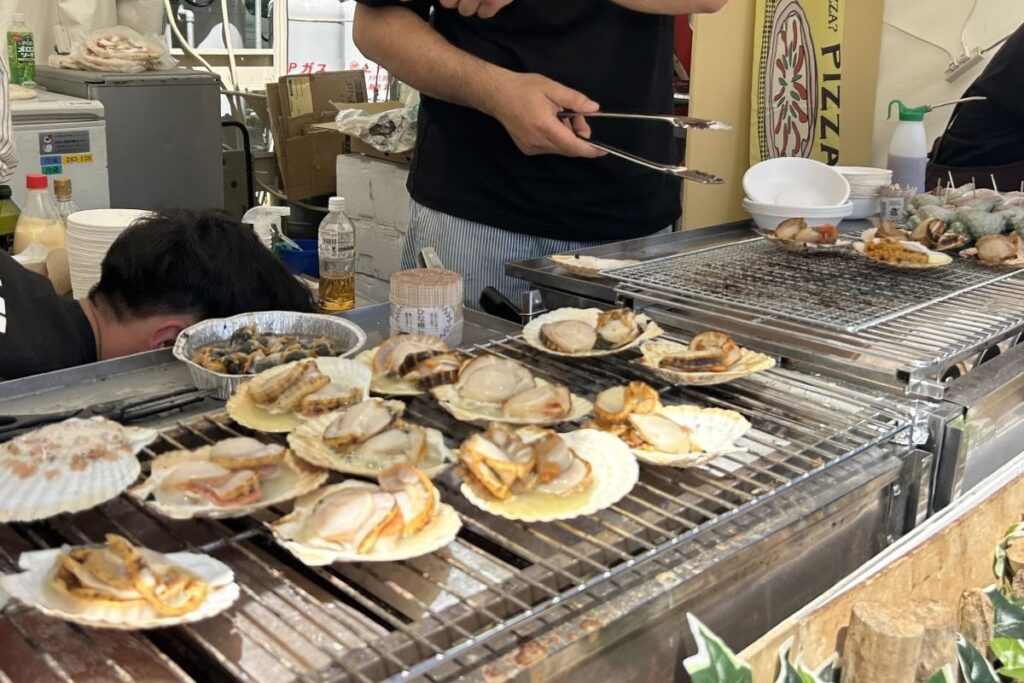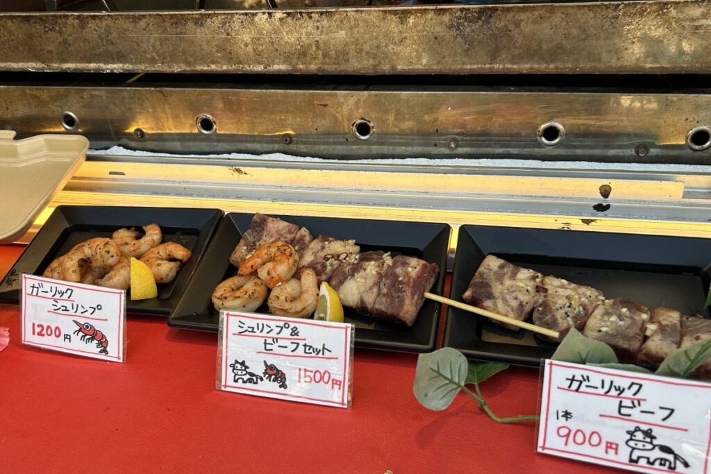 ほかにも、ホタテやツブなどの海鮮焼き、室蘭やきとり、アスパラベーコン、ガーリックシュリンプなどワインが進みそうなフードがずらりと並びます。炭火焼きの煙や漂ってくるたれのにおいで、何を食べようか迷います。