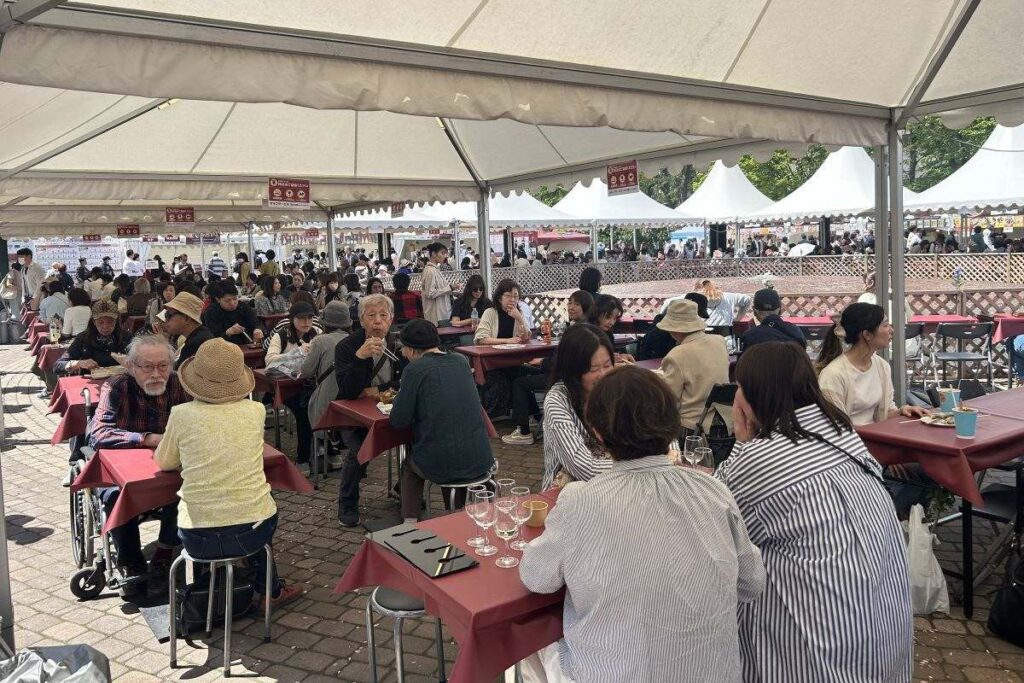 会場には中央の噴水を囲むようにして、立食スペースのほか、テント付きのベンチとテーブルも用意されています。友人同士のグループや観光客のほか、「ソロ飲み」でワインを満喫する女性など、初夏の風と北海道のおいしいものを楽しむ人たちでにぎわっています、。