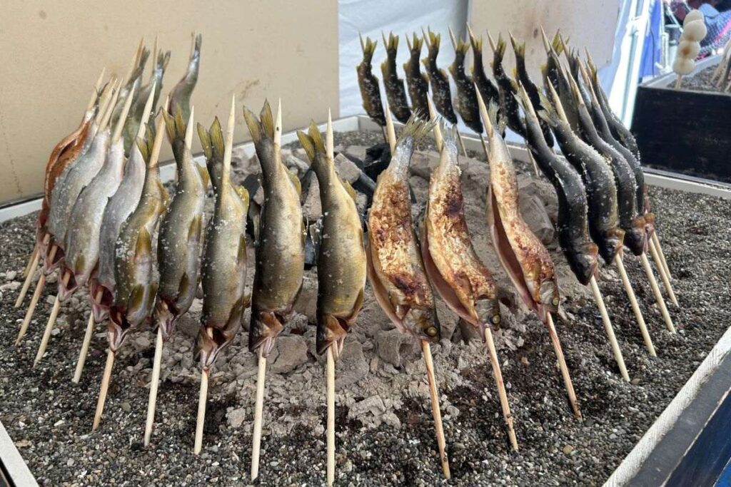 野村商店は、古平町で70年ほど養殖を続けているそうです。秋にベニザケから採卵し、川で養殖して年間通して出荷しています。提供しているLサイズ、22センチほどになるまで、1年半かかります。炭火の遠赤外線でじっくり1時間ほど火を通し、表面はぱりぱり、中はふっくら仕上げ、最後に味付けして提供しています。1串800円です。