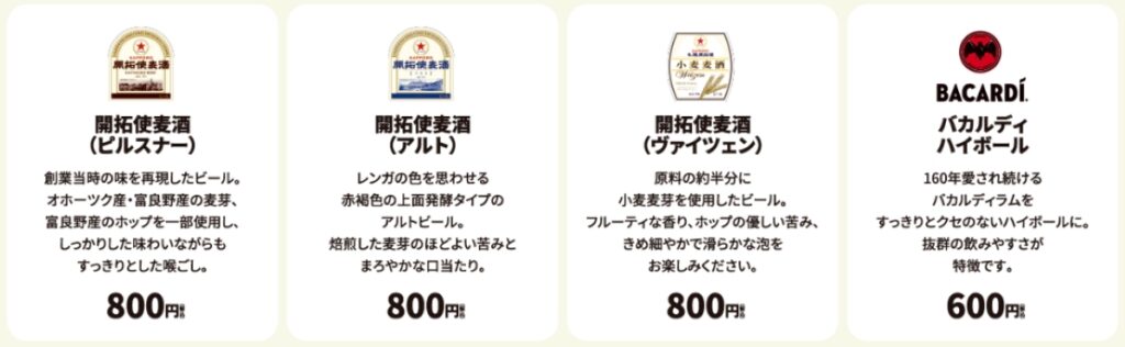 札幌開拓使麦酒醸造所で製造した数量限定の「開拓使麦酒」3種類や「バカルディハイボール」を提供。サッポロファクトリー内の飲食店のテイクアウトメニューも各店舗で販売し、ビールと共に楽しめます。