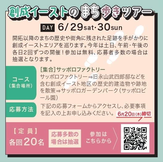 開拓以降のまちの歴史や街角に残された足跡を手掛かりに、創成イーストエリアを巡ります。29、30日の午前・午後の各日2回ずつの開催。参加は無料、応募者多数の場合は抽選となります。応募はこちら。締め切りは6月20日です。