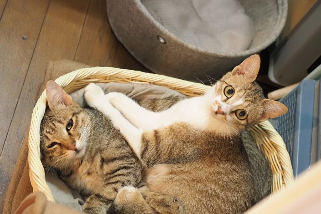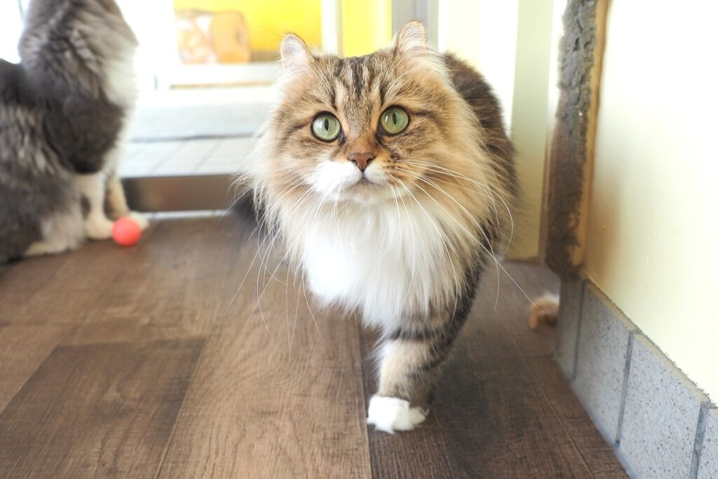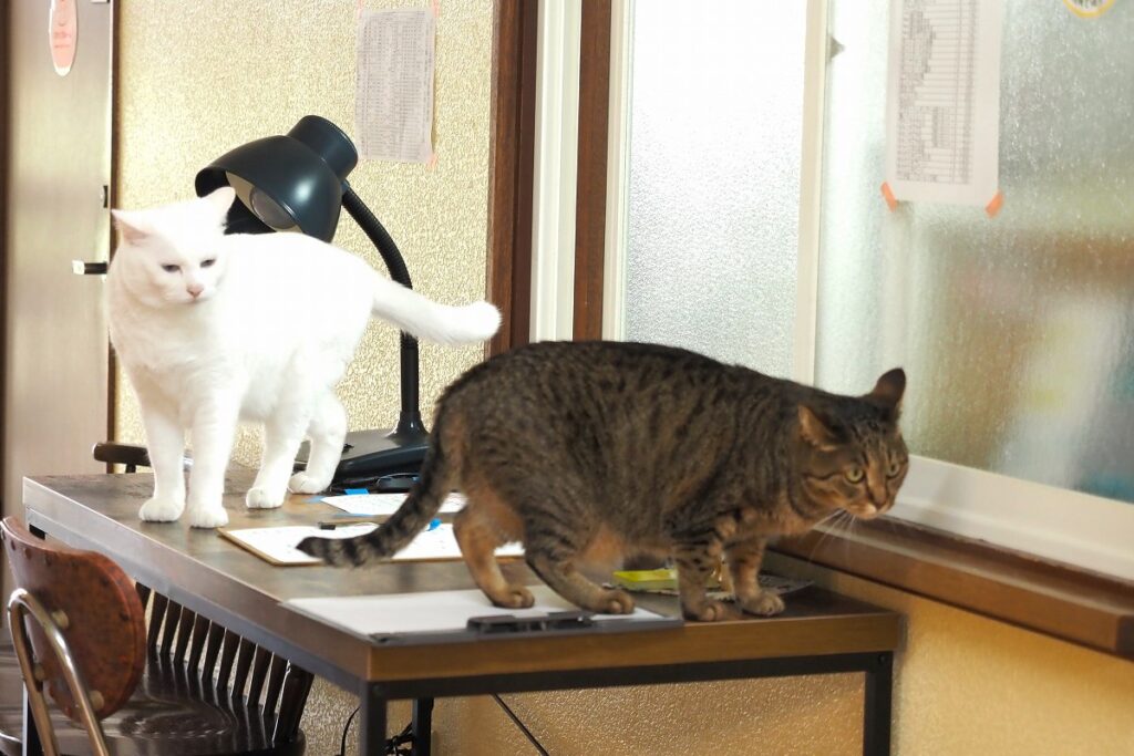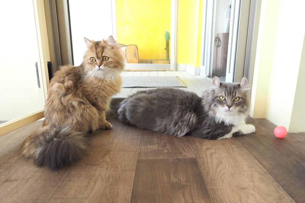 特定の猫にリクエストがあれば連れてきてもらえますが、お客さんと触れ合えるタイプの猫は限られていて、現在館内で姿を見られるのは、少し人見知りの小雪ちゃんと落ち着いたチョロくんの、ともにまだ1歳にならないきょうだいの2匹です。