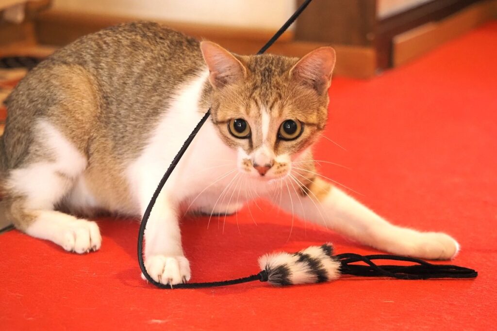 まだ小さい猫たちだけに、取材当時、小雪ちゃんはおもちゃで活発に遊んでいました。来館時に見かけたときには、一緒に遊んであげてくださいね。