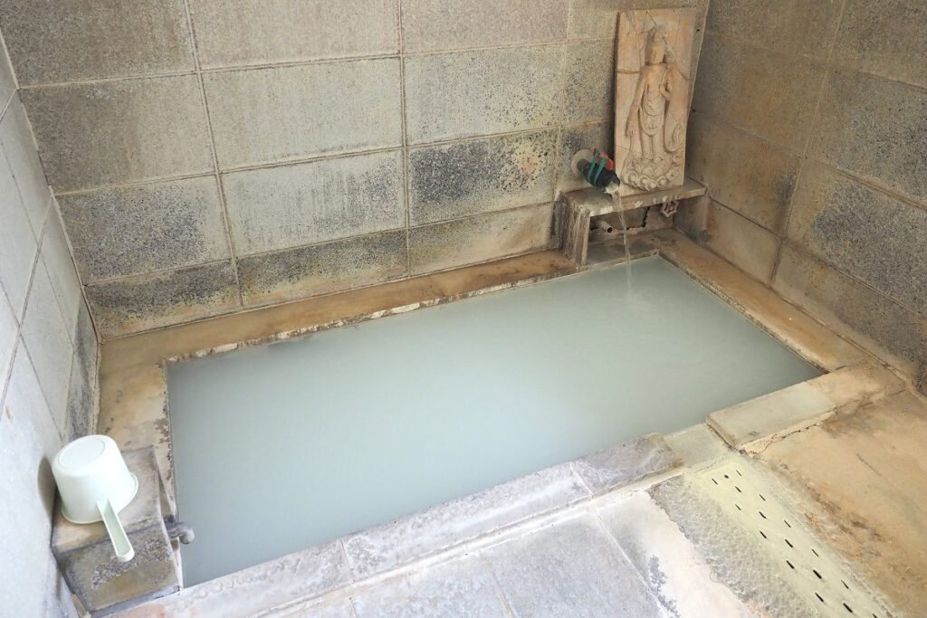 観音寺の温泉は、登別と聞いて多くの人が想像する乳白色の硫黄泉。観音寺だけで使われている貴重な独自源泉で浴室が1カ所のため、宿泊者は交代での貸切利用となります。こぢんまりとした浴室には観音様のレリーフがあり、ここがお寺であることを感じさせてくれます。