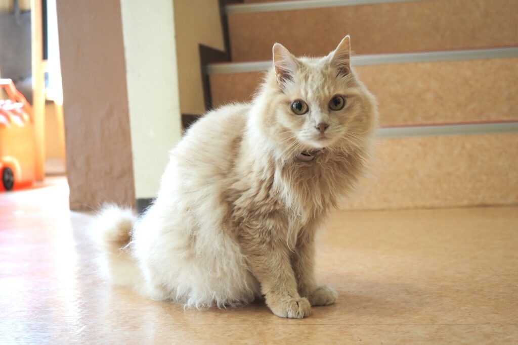 推定12歳で、たくさん撫でてもあまり嫌がらない、おとなしい猫です。アレルギーのお客さんにも配慮して、基本的にお客さんの前に出ることはありませんが、リクエストがあった場合には〝癒し担当スタッフ〟として対応してくれるそうです。