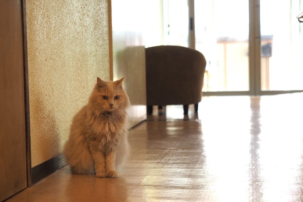 お客さんから見えないところで寝ていたり、お客さんの出入りのタイミングを狙って外へ散歩に出ることも多く、なかなか帰ってこなかったこともあります。旅館内でれんげに会えたらラッキーかもしれませんね。