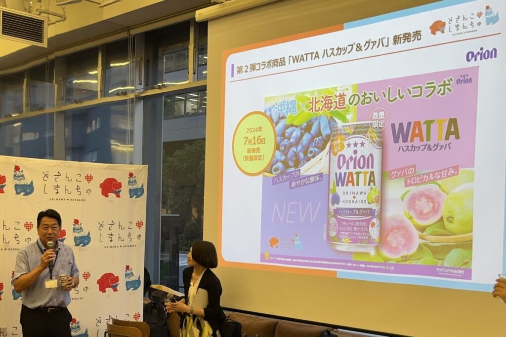 WATTAハスカップ&グァバは、どさんこしまんちゅプロジェクトの会員の三菱食品(東京)が、北海道と沖縄の食材を使った製品を開発したいとオリオンビールに持ちかけ、開発に着手。1年ほど試作を繰り返してリリースしたメロン&マンゴーが好評だったことを受け、第2弾のハスカップ&グァバが誕生しました。