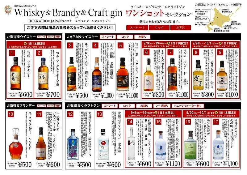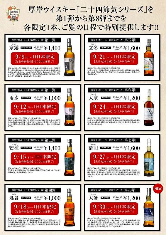 ウイスキーコーナーでは、世界的な人気で入手困難になっているニッカウヰスキーを提供するほか、生産量が少ない厚岸ウイスキーの「二十四節気シリーズ」を第1弾から第8弾まで3日ごとに1本限定で提供する特別企画も開催中とのこと。1本限定でなくなったら終了なので、早い者勝ちです。