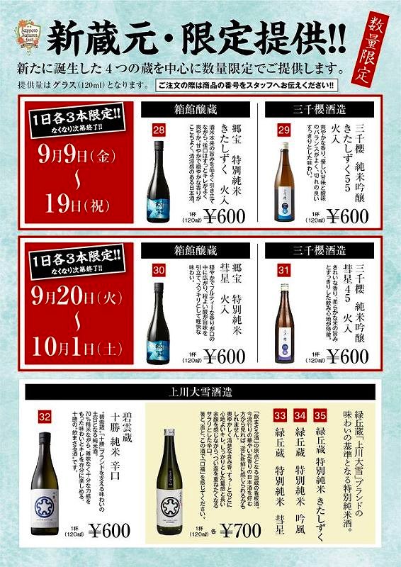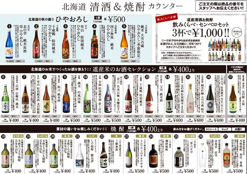 日本酒は、新しく誕生した4つの酒蔵の酒を数量限定で販売しています。上川大雪酒造は緑丘蔵(上川町)と碧雲蔵(帯広市)の純米酒を、箱館醸蔵(七飯町)と三千櫻酒造(東川町)はそれぞれ2種類を提供するそうです。