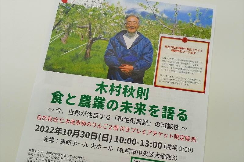 午前10時開会、午後1時閉会。道内で木村さんの農法を学ぶ「Hokkaido木村秋則自然栽培農学校」の主催です。