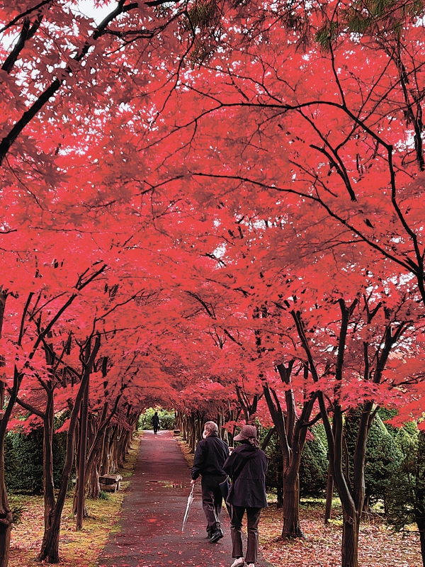 1984年に開園した約3万平方メートルの広さの公園。ヤマモミジやシダレモミジなど8種類のモミジ類を700~800本植栽。圧巻は真っ赤に染まるノムラモミジの約200メートルの並木道。幻想的な雰囲気で、大手航空会社のカレンダーにも採用された。