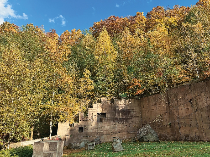 札幌軟石の巨大な石切り場跡を再生した公園で「ふるさと文化百選」にも選ばれている。黄に染まったシラカバを背景に、歴史を感じる岩肌と現代アートとの対比が印象的。11月3日までライトアップを開催。