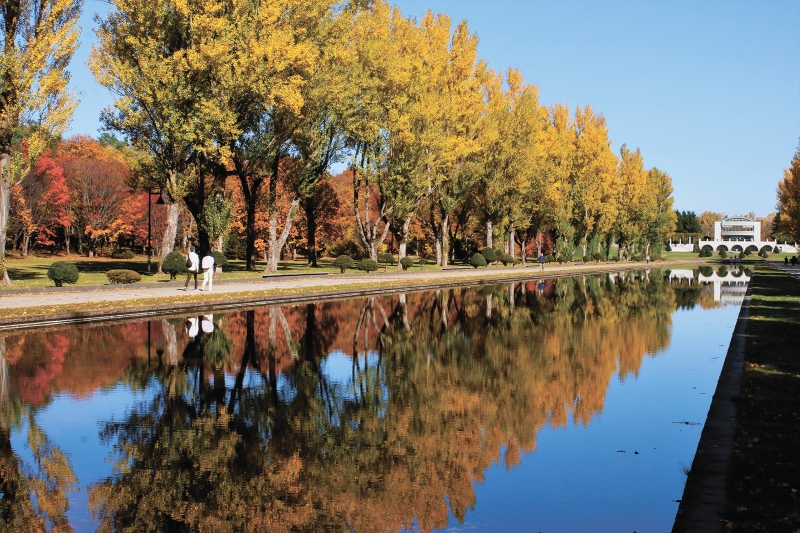 約60万平方メートルの敷地の半分が森林で、樹木の数は約7万本。モミジやカエデ、ポプラ、ナナカマド、エゾヤマザクラなどが色づく。全長600メートル、幅15メートルのカナール(水路)の水面に、約200本のポプラと青空が映るシーンはフォトスポットとしても人気。