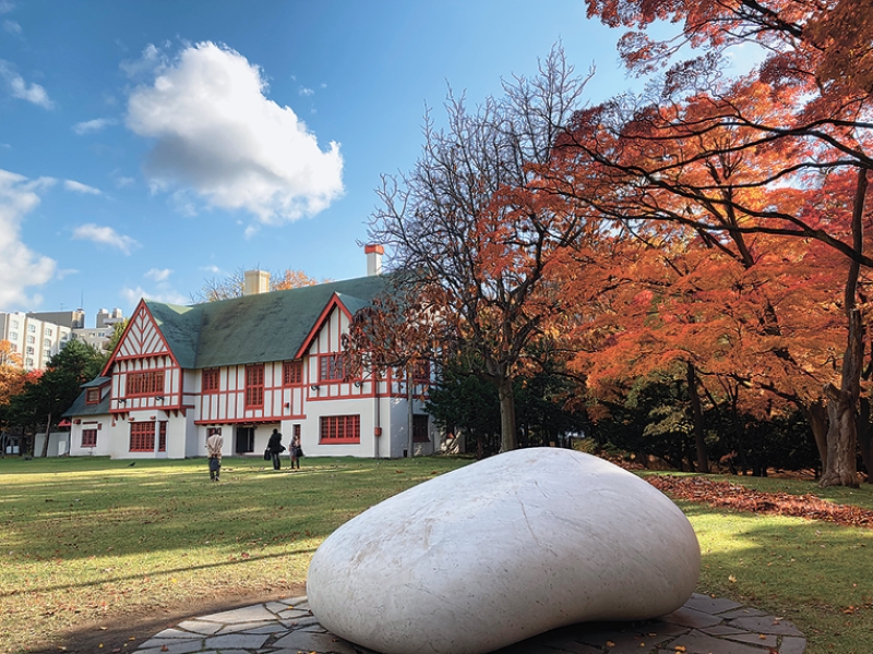 約30万5千平方メートルの敷地は自然豊かで、緑やアートと触れ合える散策路がある。「壁一面を覆うツタが深紅に染まり、カエデやイチョウが色づいて見事です。運が良ければエゾリスに出合えるかも」(リポーター・相庭陽子)