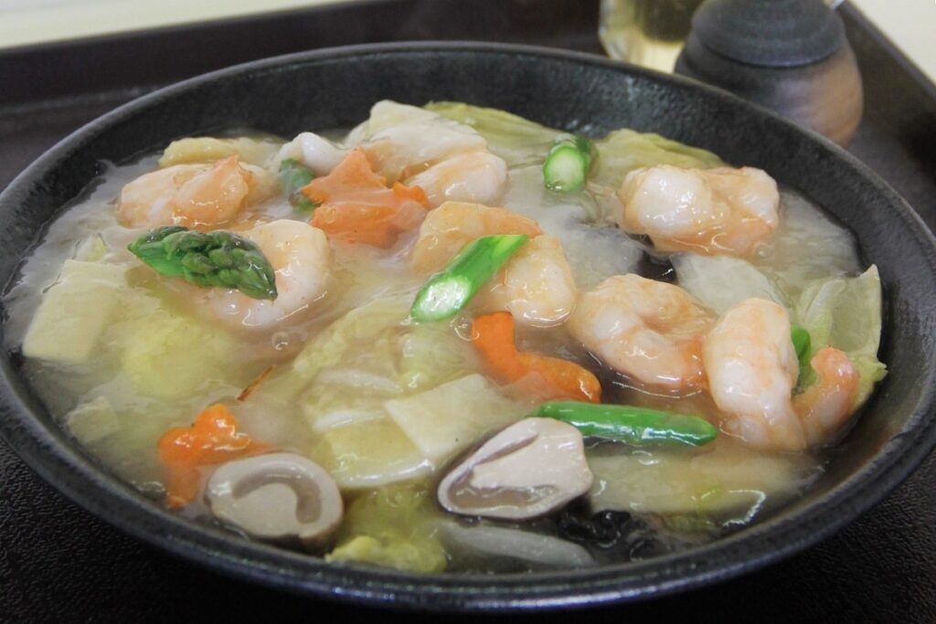 「エビ入りあんかけ焼きそば」「五目あんかけ焼きそば」「豚肉細切りあんかけ焼きそば」の3種類はどれも人気で甲乙つけがたいそうですが、特にオススメなのは塩味の「エビ入りあんかけ焼きそば」。エビ入りとはいえ、豚肉やイカ、うずらにたけのこ、人参にきくらげ、ヤングコーン、季節の青菜や珍しいフクロダケまで入り本当に具材豊富! 一見するとそれほど多く見えないのですが、麺の食感や種類豊富な具材のおかげか、非常に満腹になる一品です。