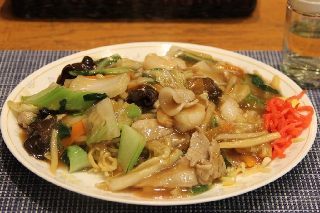 しっかり焼かれた麺に白菜やもやし、玉ねぎ、人参、きくらげ、豚肉と、イカやエビ、ホタテも入った具沢山な「あんかけ焼きそば(醤油味)」は、あっさりとして最後まで食べ飽きしない美味しさです。