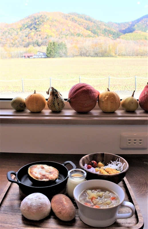 料理は陽子さんが担当し、ファームを手伝っているボランティアの学生らとメニューを考えている。ランチは月替わりで、10月は「かぼちゃグラタン」と「鹿肉おひさまバーガー」(いずれも単品600円、セットメニューも用意)。自身の畑で育てたトウモロコシやジャガイモをはじめ、近隣の農家や食品業者から調達したカボチャや牛乳、卵、ベーコン、鹿肉などをふんだんに使っている。